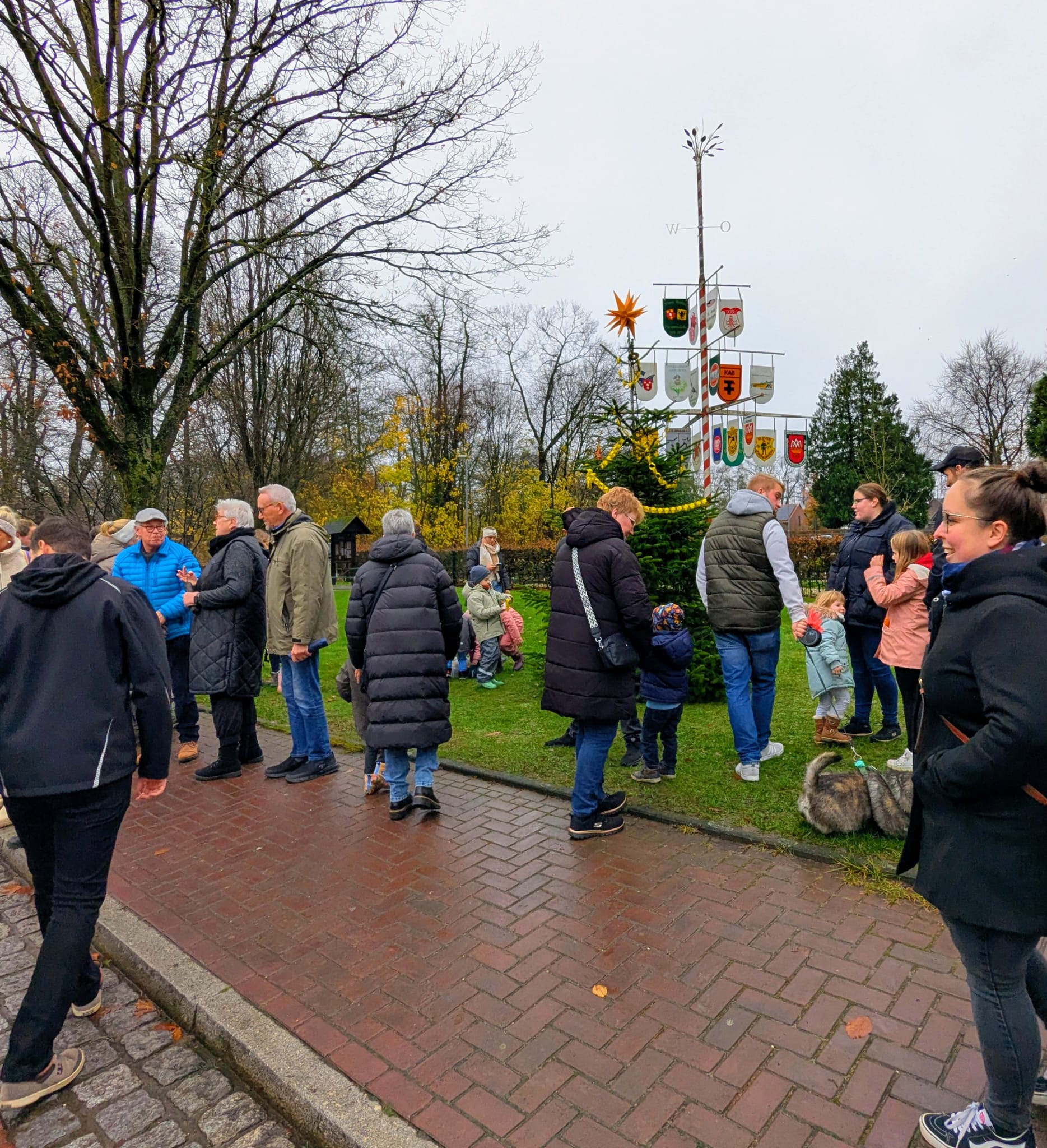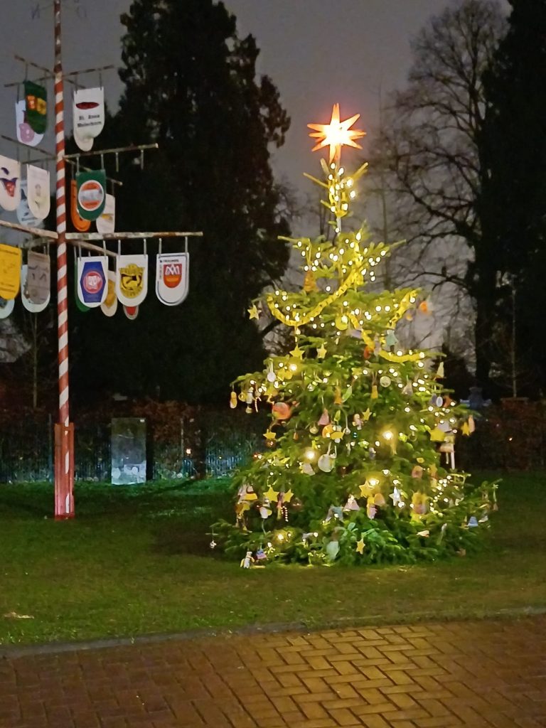 Am 27.11.25 haben einige Vorstandsmitglieder der Heimatfreunde Materborn vor dem Ratskrug den Weihnachtsbaum aufgestellt, die Lichterkette angebracht und die Spitze des Baumes geschmückt.